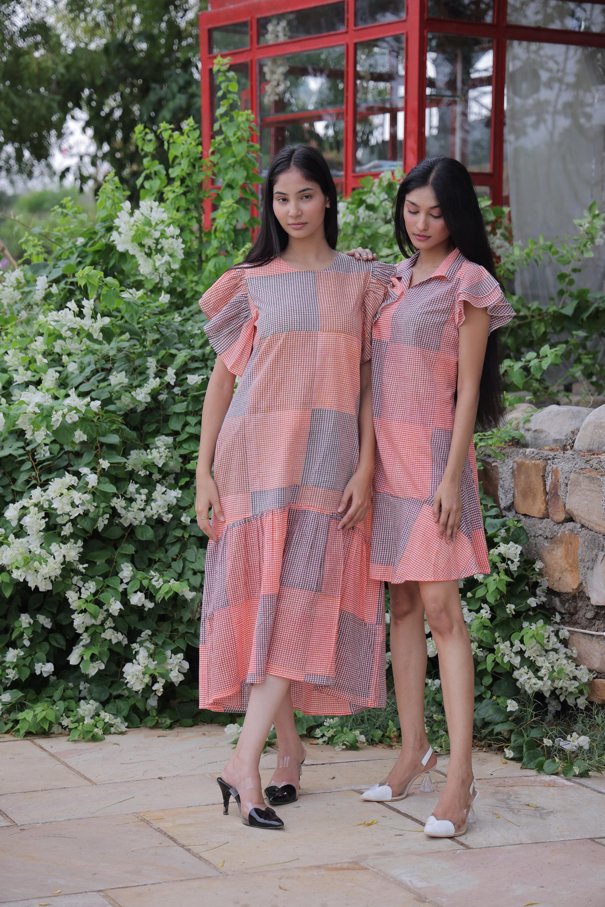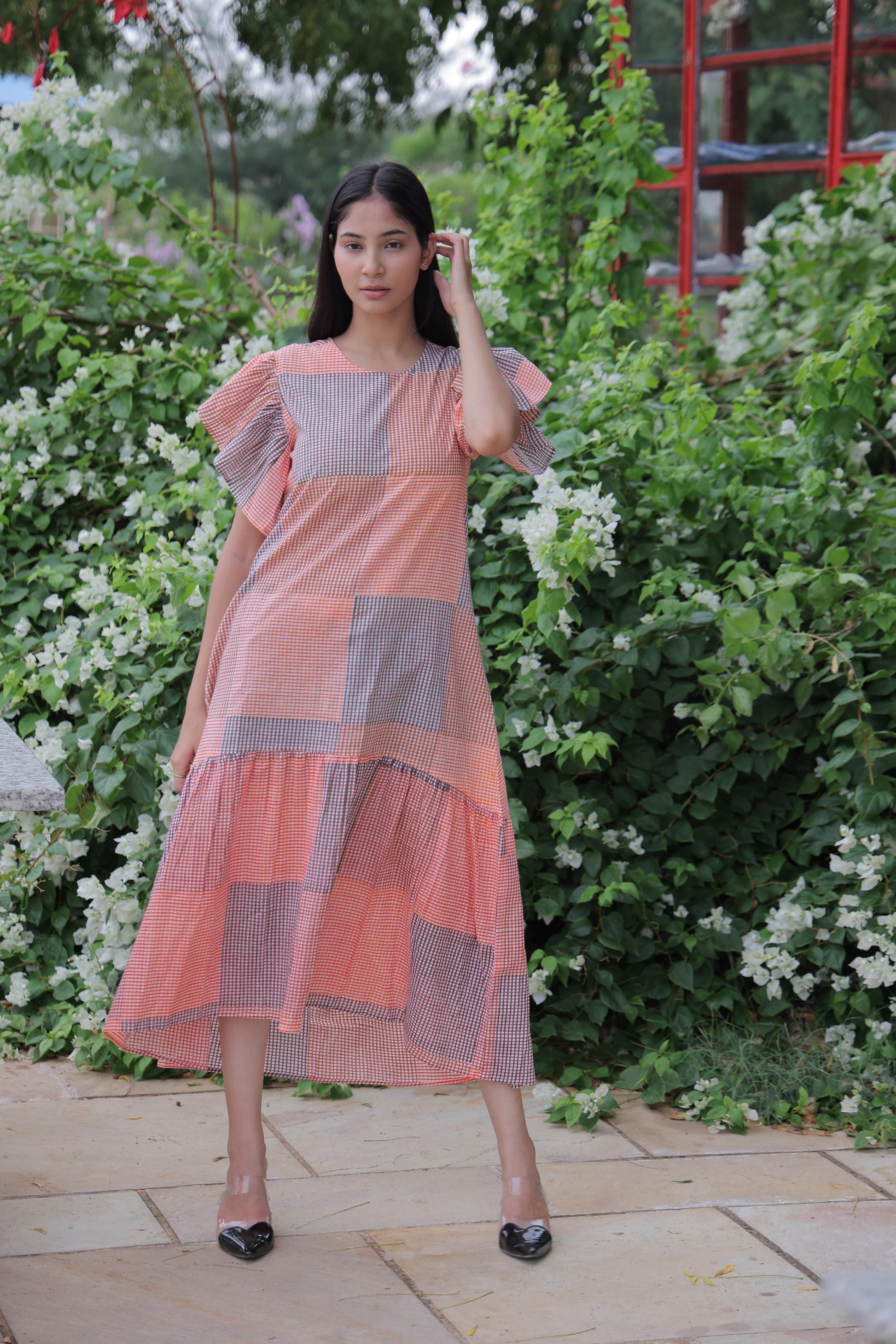 Breezy orange cotton block print long dress with flutter sleeves and tiered hem.