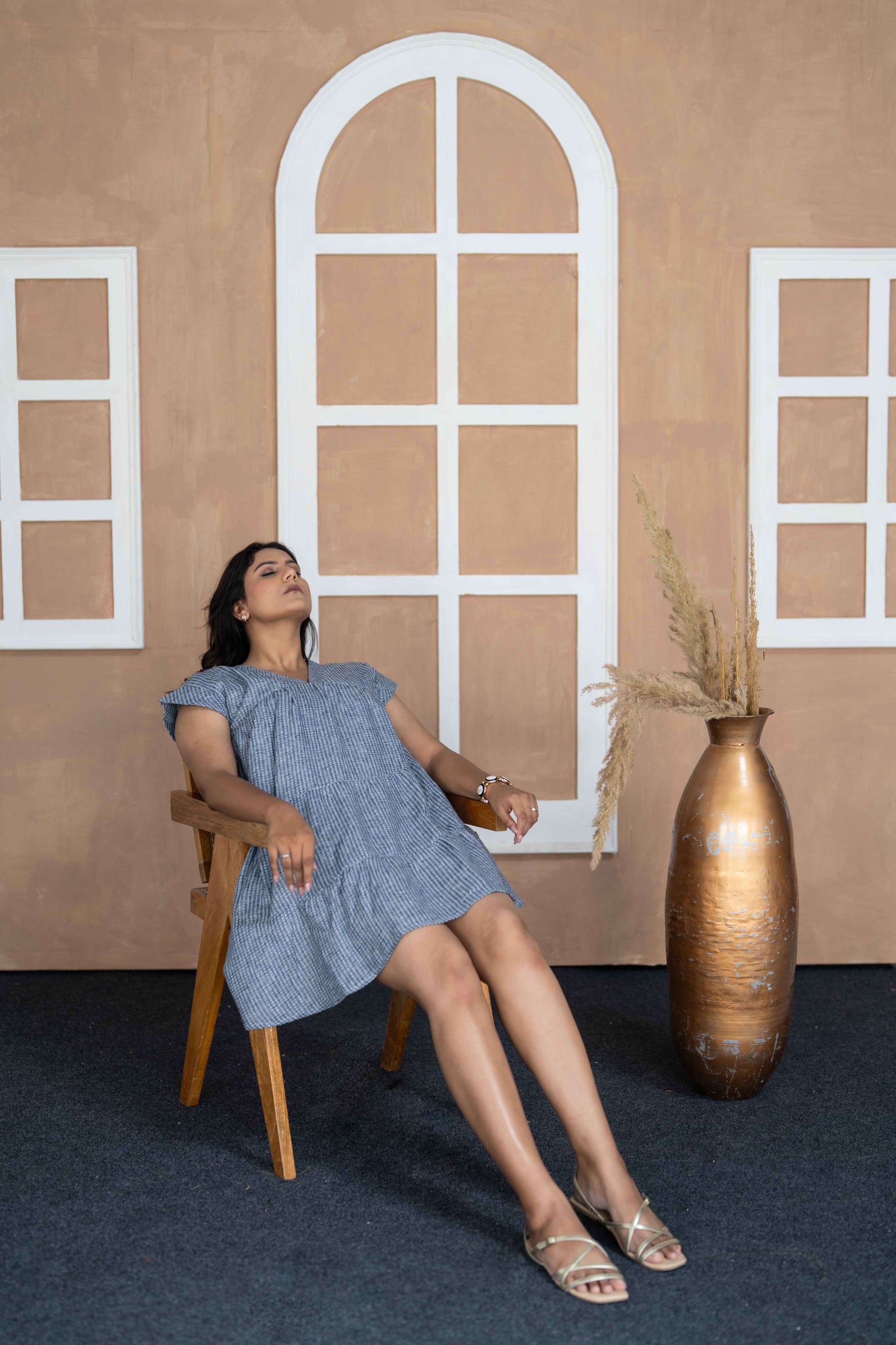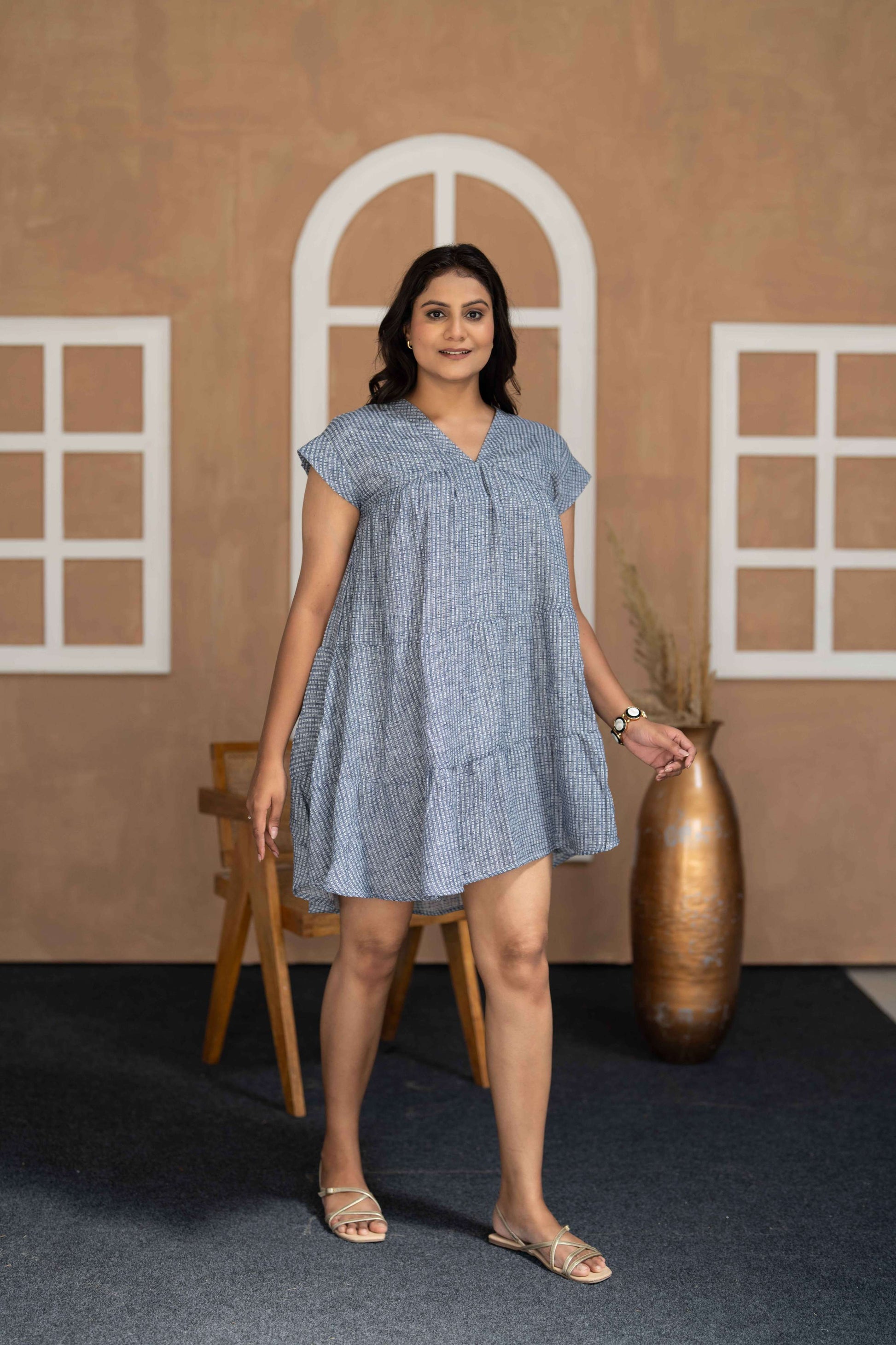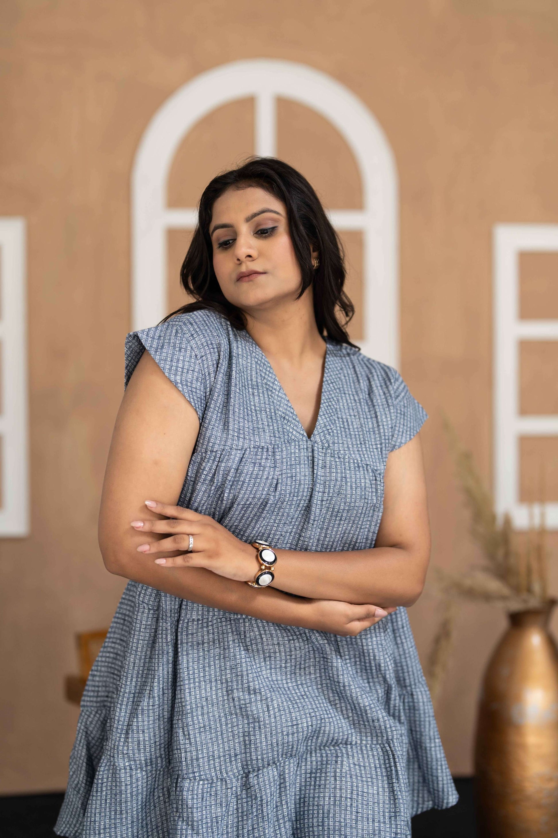 Blue jaquard square print short tunic in free size to inhance oversized look