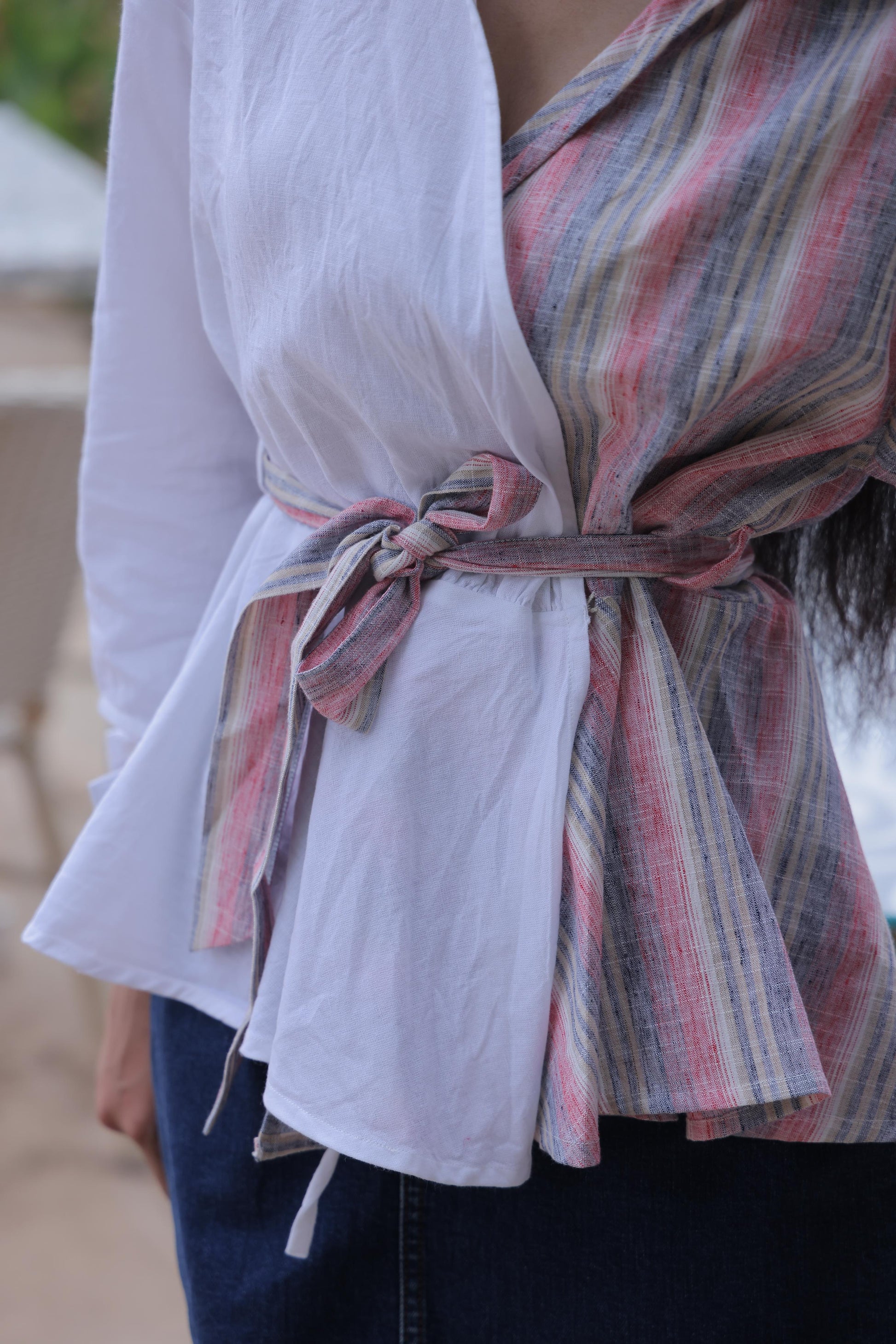 Playful pink and white half-and-half shirt in breathable cotton yarn dye, finished with tie waist style.