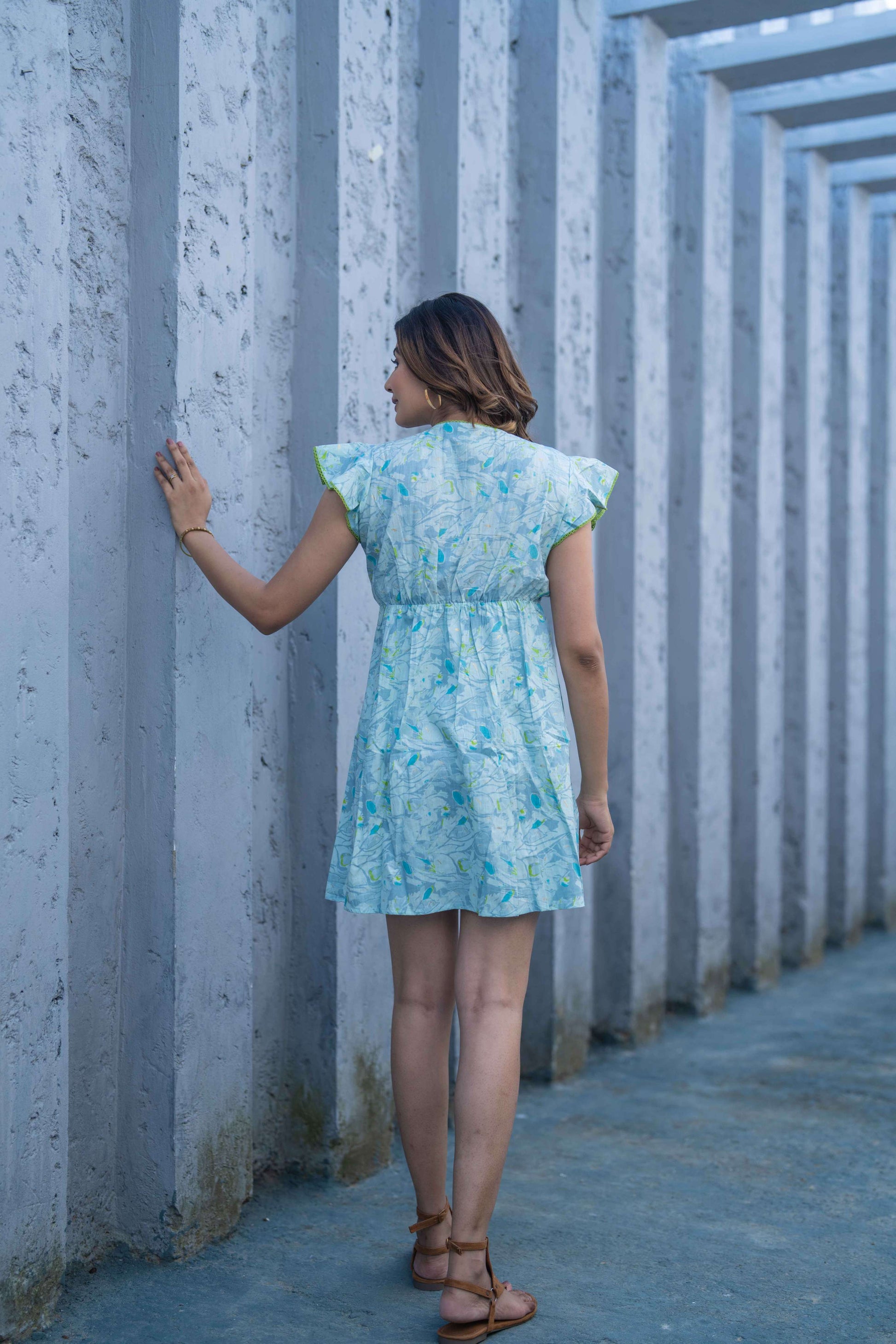 Playful foil print cotton short dress with flutter sleeves, V-neckline, and cinched waistline.