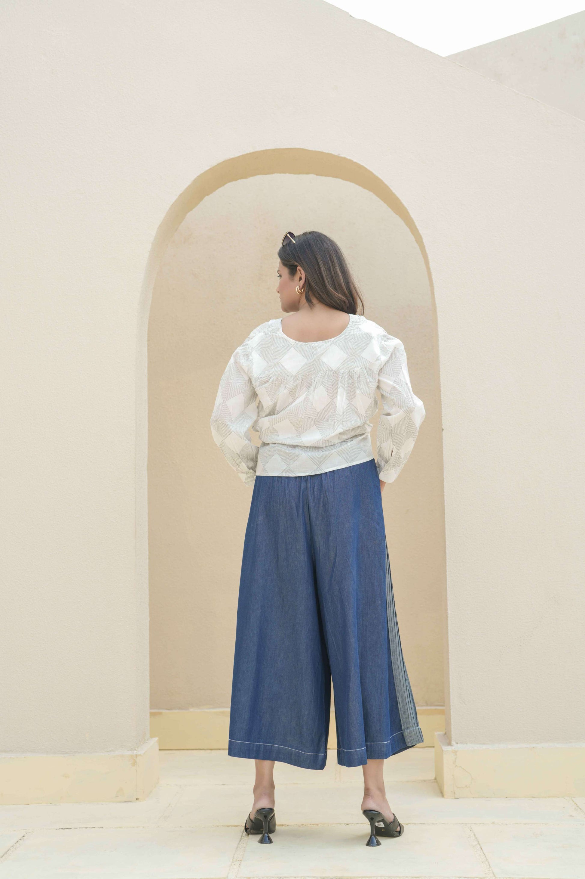 Grey and white block print shirt top with inside string with wooden hangings to adjust