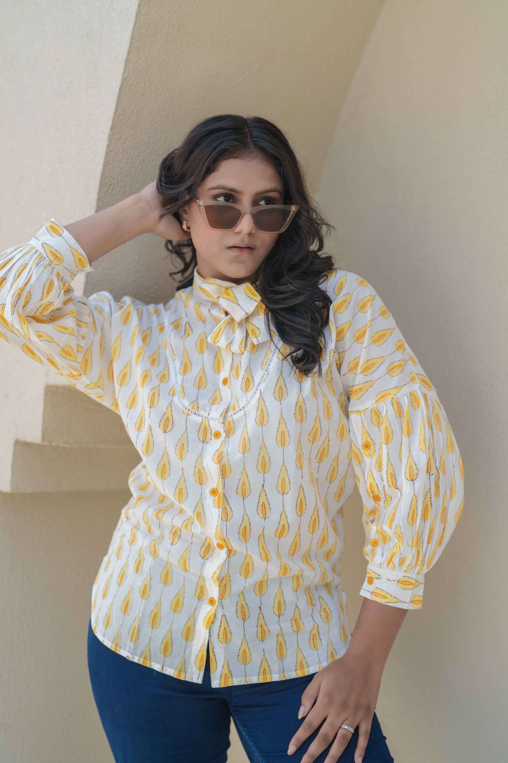 Block print shirt with bow detailing extra with ladder lace and button detailing
