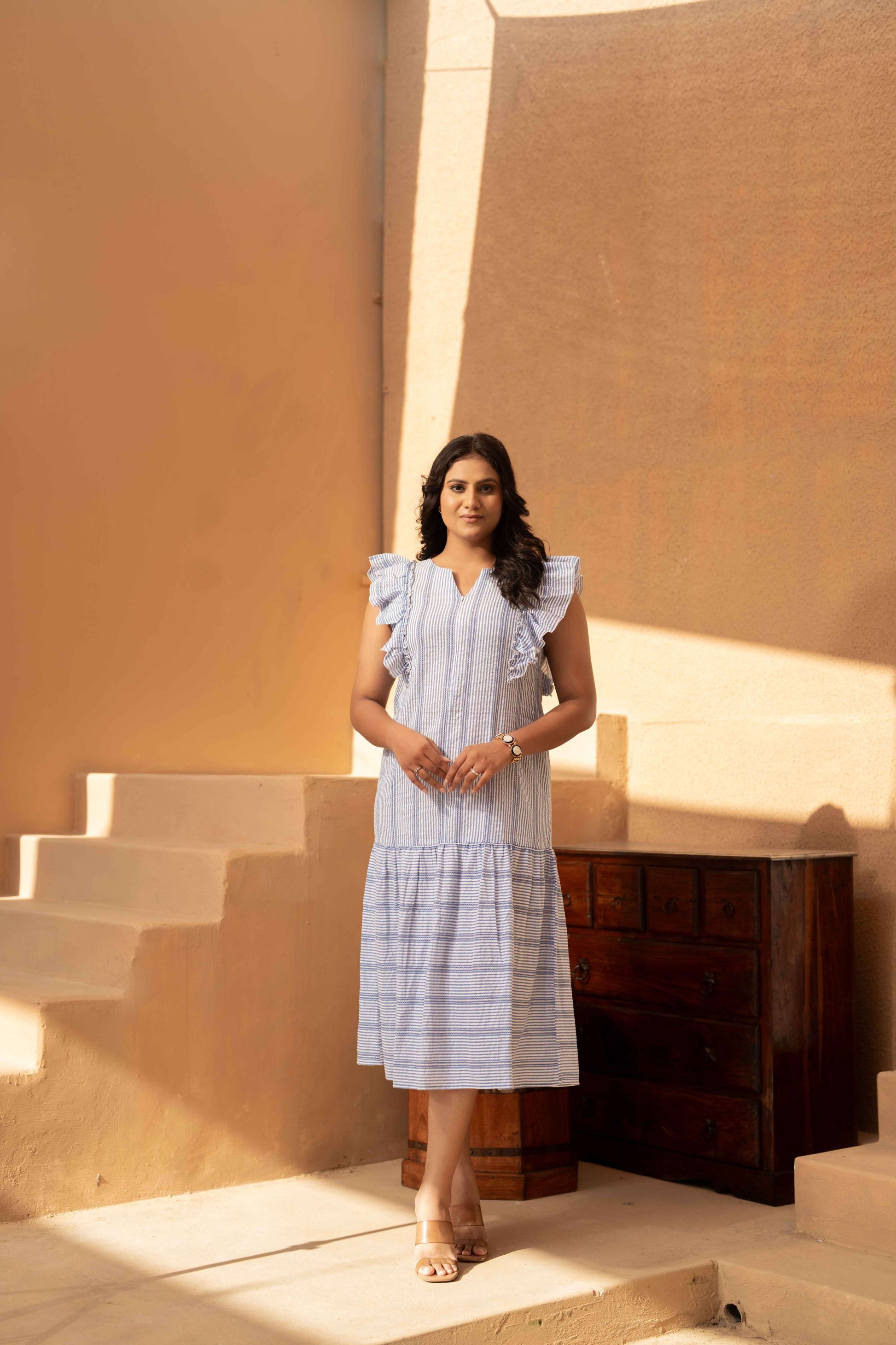 Hakoba dress with lines yarn dyed with sleeves with front zip neckline