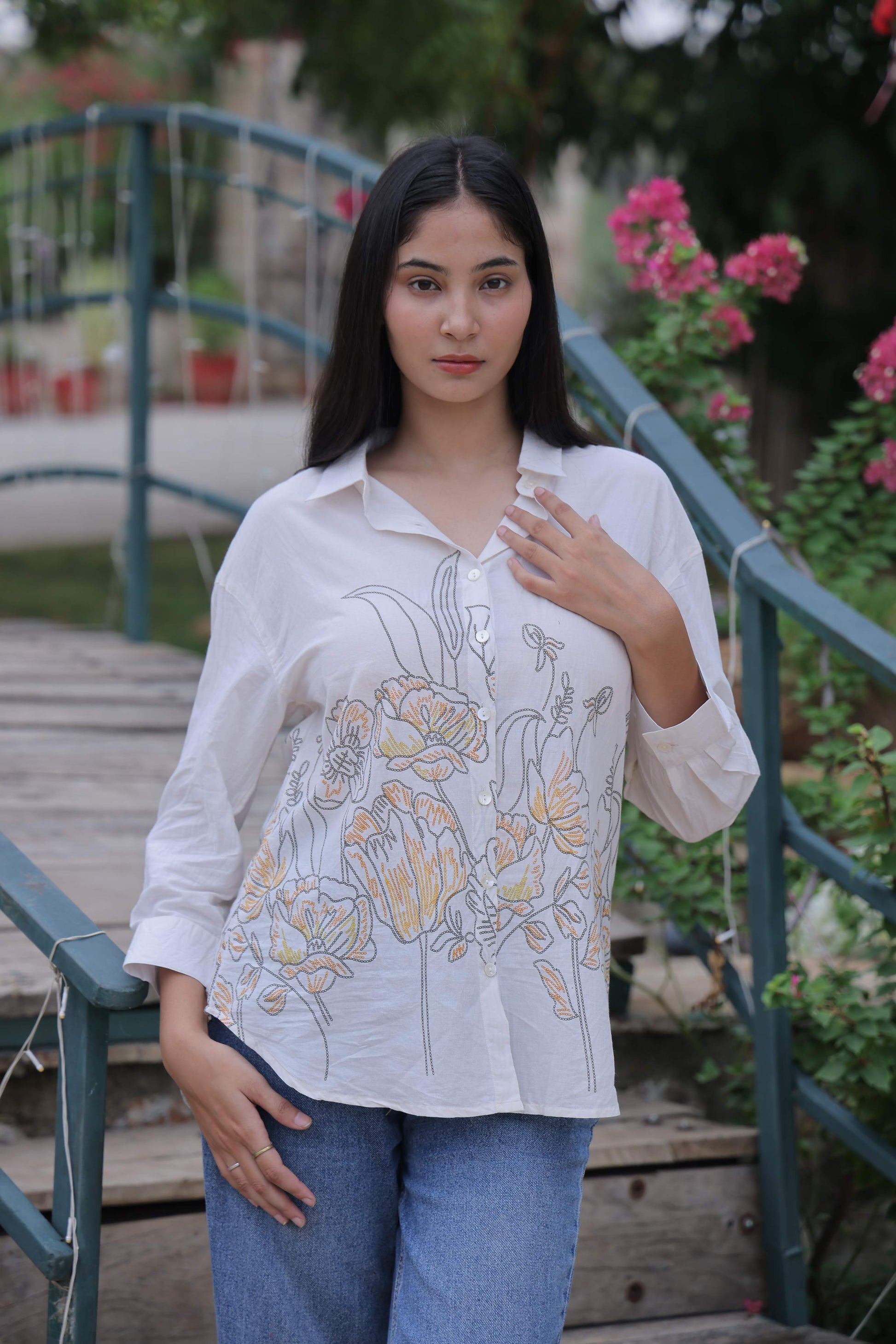 Classic button-down cotton shirt with soft pastel floral prints, relaxed fit for casual chic styling.